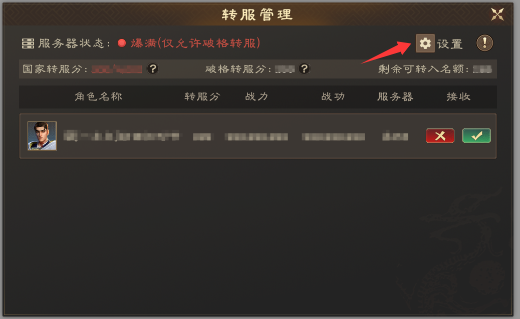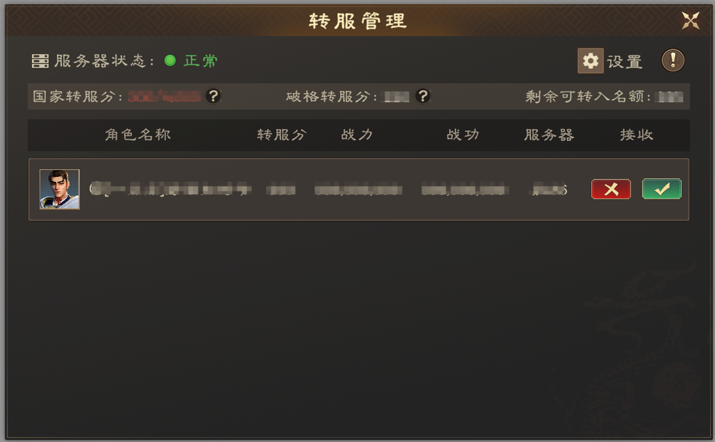 2. ?皇帝審批:僅皇帝有權(quán)對對轉(zhuǎn)服申請進行審核,決定是否批準。點擊“轉(zhuǎn)服總覽”界面點擊【轉(zhuǎn)服管理】功能入口,可查看收到的轉(zhuǎn)服申請。