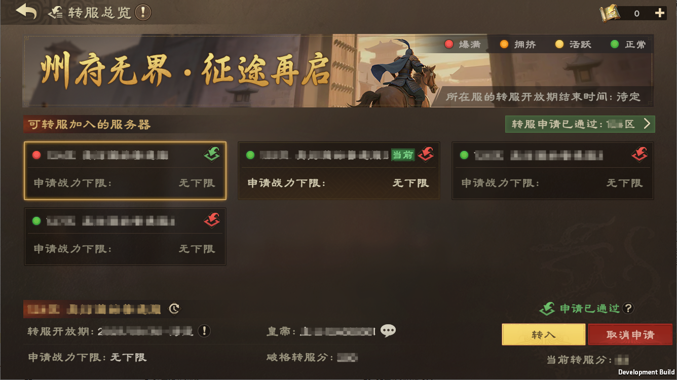 點擊后,在“轉(zhuǎn)服總覽”界面,滿足轉(zhuǎn)服條件后可以向心儀的目標(biāo)服務(wù)器提交申請。(若主公的戰(zhàn)力低于一定戰(zhàn)力(S1:4,000,000),則無需經(jīng)過審批,也不占用目標(biāo)服的移民名額)