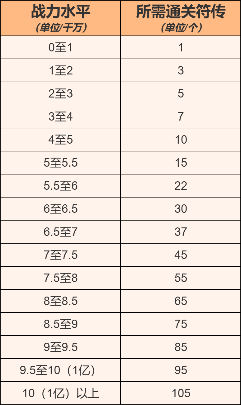 7. 擁有足夠的通關(guān)符傳道具,角色戰(zhàn)力與所需數(shù)量的對應(yīng)關(guān)系如下: