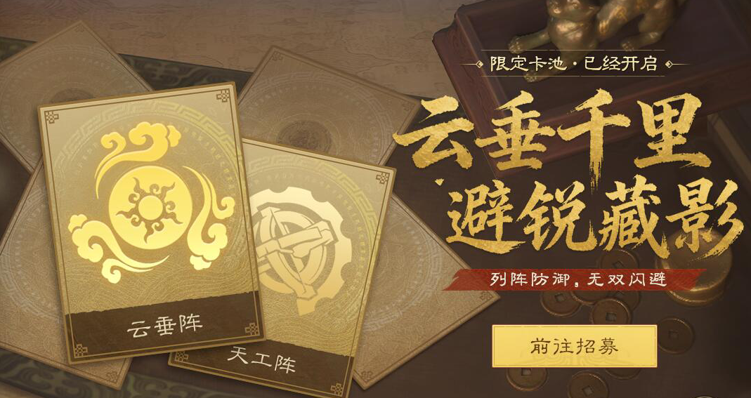 云垂陣:激活此陣,部隊(duì)有概率觸發(fā)【閃避】狀態(tài),在此狀態(tài)下將完全免疫普攻傷害及判定,是對抗主流普攻隊(duì)伍的終極手段。