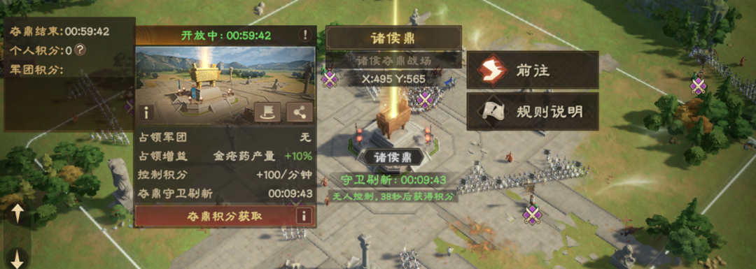 ● 當(dāng)奪鼎區(qū)內(nèi)(鼎附近的正方形區(qū)域)僅剩己方軍團(tuán)的部隊(duì)時(shí),視為暫時(shí)占領(lǐng),暫時(shí)占領(lǐng)后奪鼎區(qū)內(nèi)的所有部隊(duì)每分鐘都可獲得個(gè)人和軍團(tuán)積分;