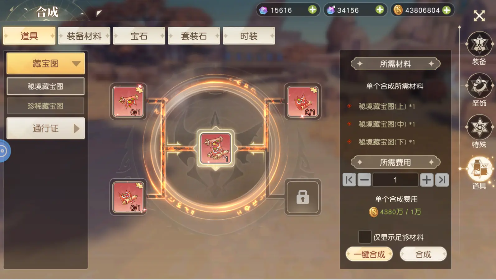 道具:可將日常道具合成為高級的日常道具,包括藏寶圖合成、裝備材料合成、寶石合成、套裝石合成和時裝合成。以上合成在上文有羅列。