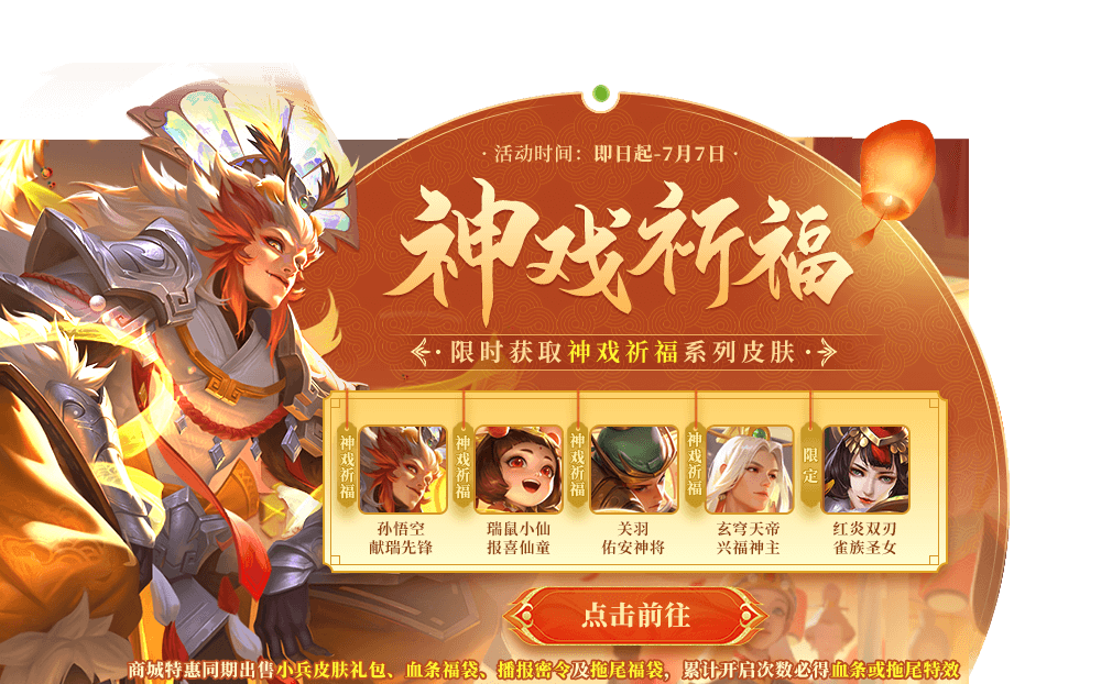 神戲祈福套系皮膚兌換活動開啟!通過每日登錄禮包獲得兌換幣到達一定數(shù)量即可兌換孫悟空-獻瑞先鋒、瑞鼠小仙-報喜仙童、關(guān)羽-佑安神將、玄穹天帝-興福神主、紅炎雙刃-雀族圣女等皮膚!