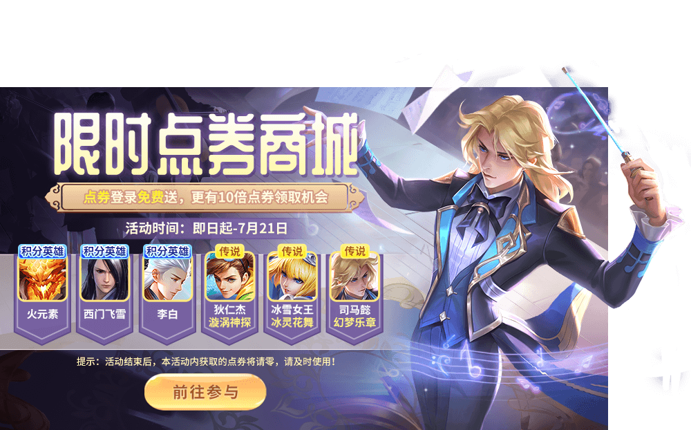 參與一次6元直購即可開啟豪華商城,火元素、李白、西門飛雪、曹操、狄仁杰-漩渦神探、冰雪女王-冰靈花舞、司馬懿-幻夢樂章等你來兌換哦!