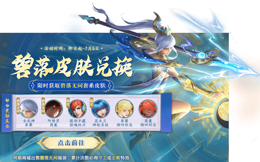 碧落皮膚限時(shí)兌換開啟,女武神-參黎、阿修羅-商麓、服部半藏-影魂雙刃、花木蘭-神槍圣徒、商麓溯回形態(tài)、參黎溯回形態(tài)等你來拿!