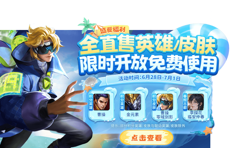 限時(shí)免費(fèi)使用池更新!活動(dòng)期間全直售英雄/皮膚限時(shí)免費(fèi)開放!積分英雄曹操、金元素、稀有皮膚曹操-零域劍影、李探花-臨安仲春等限時(shí)免費(fèi)開放使用!