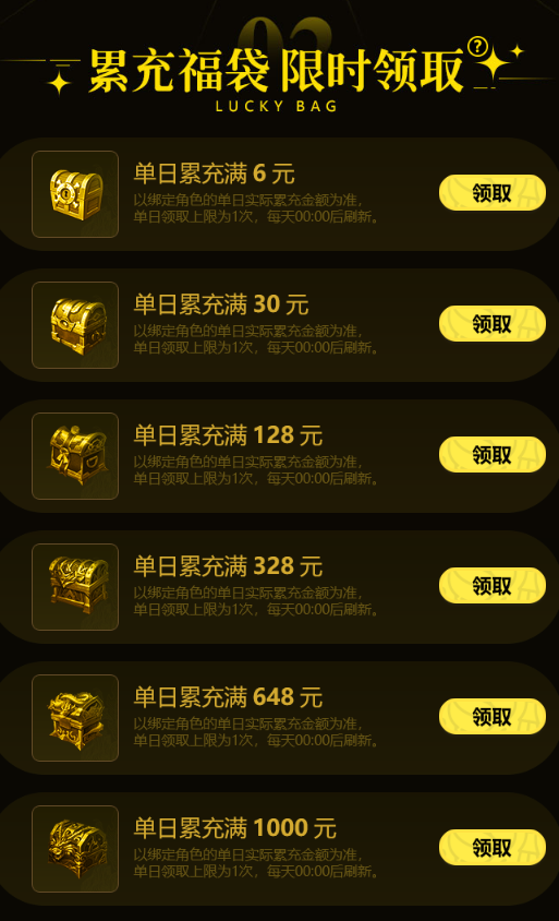 1.活動(dòng)期間每日累充到達(dá)對(duì)應(yīng)的檔位,可以領(lǐng)取對(duì)應(yīng)的獎(jiǎng)勵(lì)。