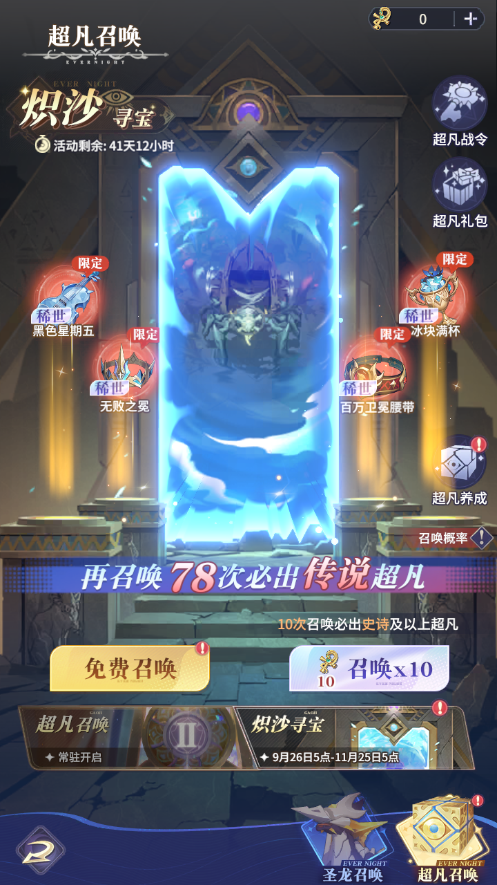 1、卡池類型:常駐「超凡之門」和S2賽季「熾沙尋寶」。