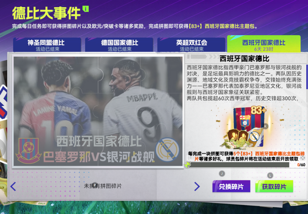 完成每日任務(wù)即可獲得拼圖碎片以及歐元/突破卡等諸多獎(jiǎng)勵(lì),完成拼圖即可獲得【83+】西班牙國(guó)家德比主題包。