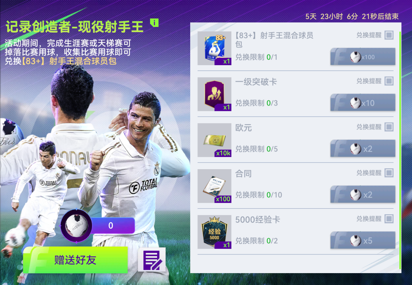 活動(dòng)期間,完成生涯賽或天梯賽可掉落比賽用球,收集比賽用球即可兌換【83+】射手王混合球員包。