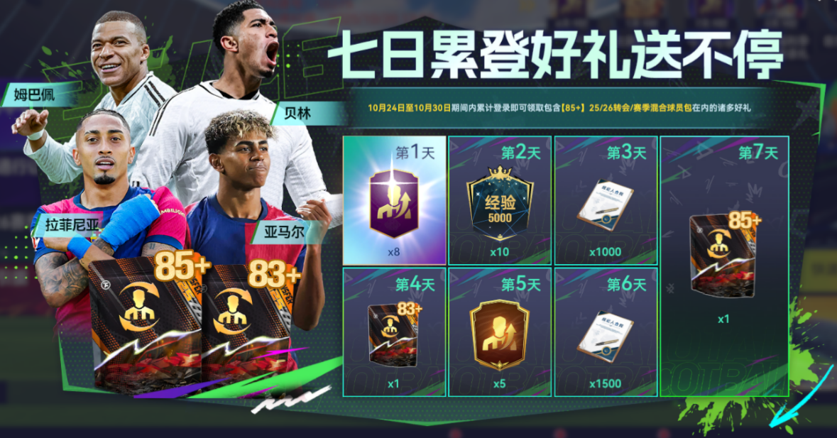 活動(dòng)期間累計(jì)登錄,即可獲得包含【85+】轉(zhuǎn)會(huì)/賽季之星混合球員包在內(nèi)的諸多豪禮。