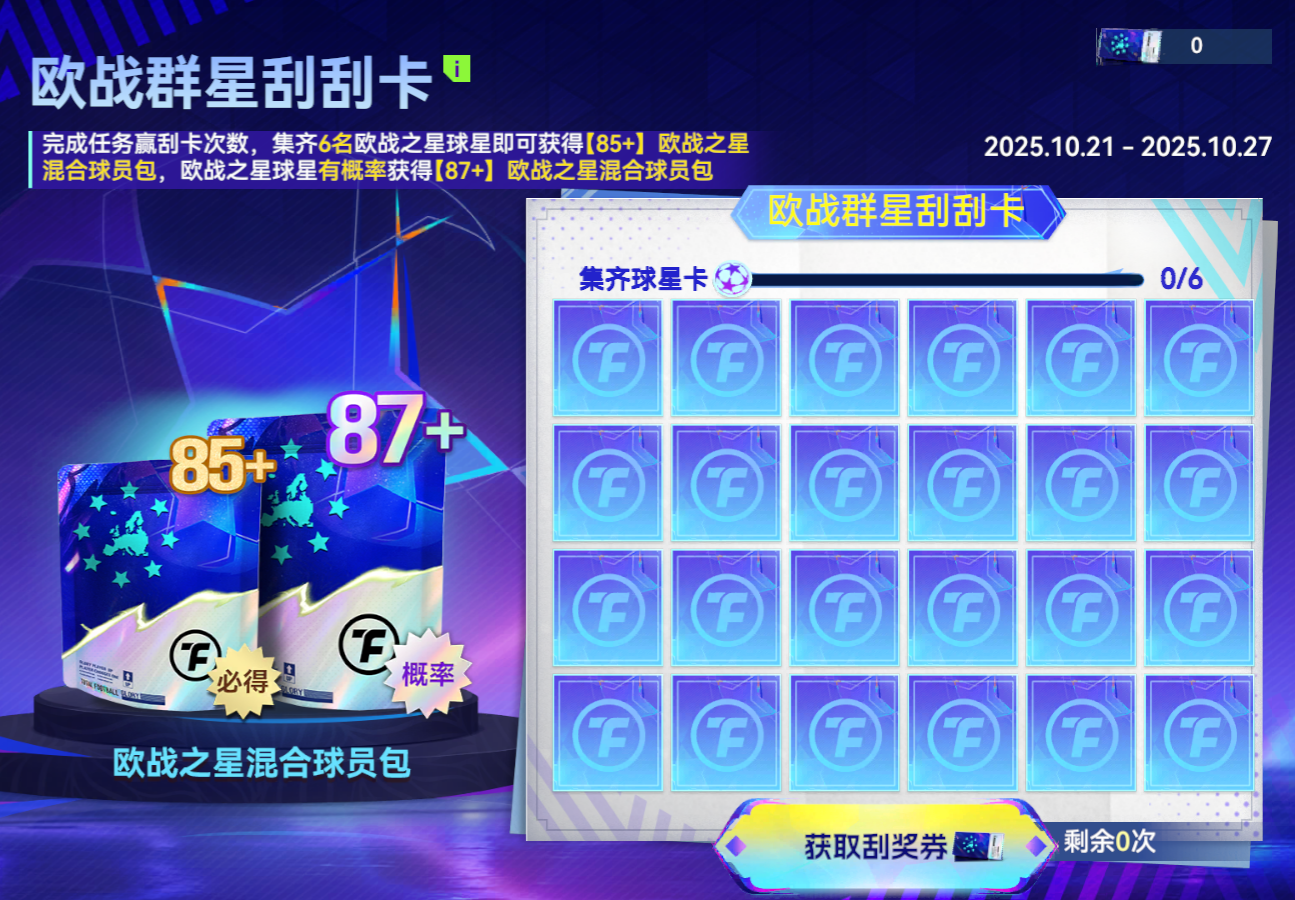 刮開球員卡概率獲得【87+】歐戰(zhàn)之星混合球員包。