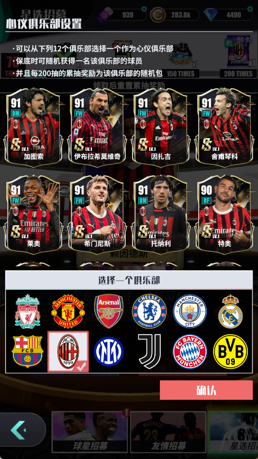玩家可以在游戲中的星選招募中選擇AC米蘭作為自己的心儀俱樂(lè)部,增加抽到AC米蘭球員的概率,并且保底時(shí)可隨機(jī)獲得一名該俱樂(lè)部的球員,并且每200抽的累抽獎(jiǎng)勵(lì)位該俱樂(lè)部的90-92隨機(jī)包。